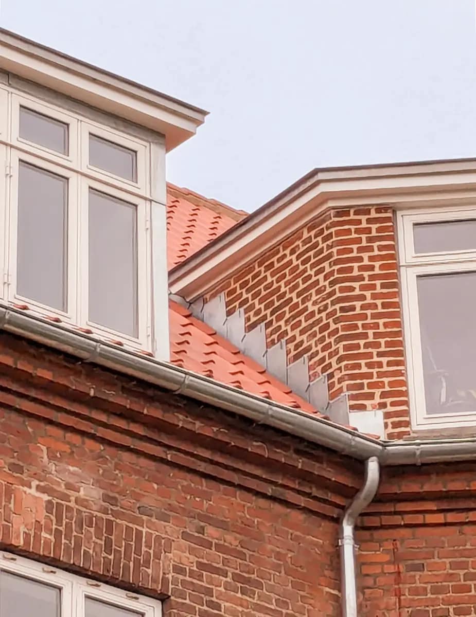 Klassisk bygning fra 1930’erne bag Ordrup Station, opført i rød mursten med halvvalmet tag. Ejendommen rummer 8 lejligheder omkring en central trappeopgang. Taget er gennemrenoveret med Herregårds vingetagsten, og kvistene er istandsat med ny falset zink.